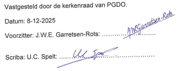 PGDO wil graag een veilige plaats zijn voor iedereen. Veilig om te zijn wie je bent en veilig om je geloof te beleven. Maar wij beseffen dat dit helaas niet vanzelfsprekend is. Overal waar gewerkt wordt, kunnen misverstanden ontstaan en worden fouten gemaakt. Vaak onbewust, maar soms ook opzettelijk. Ook binnen kerkelijke organisaties komt ongewenst gedrag en misbruik voor. Soms overduidelijk en soms niet goed te herkennen. Door opmerkingen die over grenzen gaan, een te nadrukkelijke aanraking of andere ongewenste intimiteit. De kerkenraad vindt daarom afspraken over de manier van omgaan met elkaar belangrijk, omdat alle leden van onze gemeente zich veilig moeten kunnen voelen. Problemen lossen we vanzelfsprekend het liefst samen op, maar soms is dat niet genoeg of niet meer mogelijk. Wanneer men zich niet wil of kan wenden tot een kerkenraadslid of predikant kan men contact opnemen met één van onze vertrouwenspersonen. Deze kan adviseren over wat te doen in een dergelijk geval.